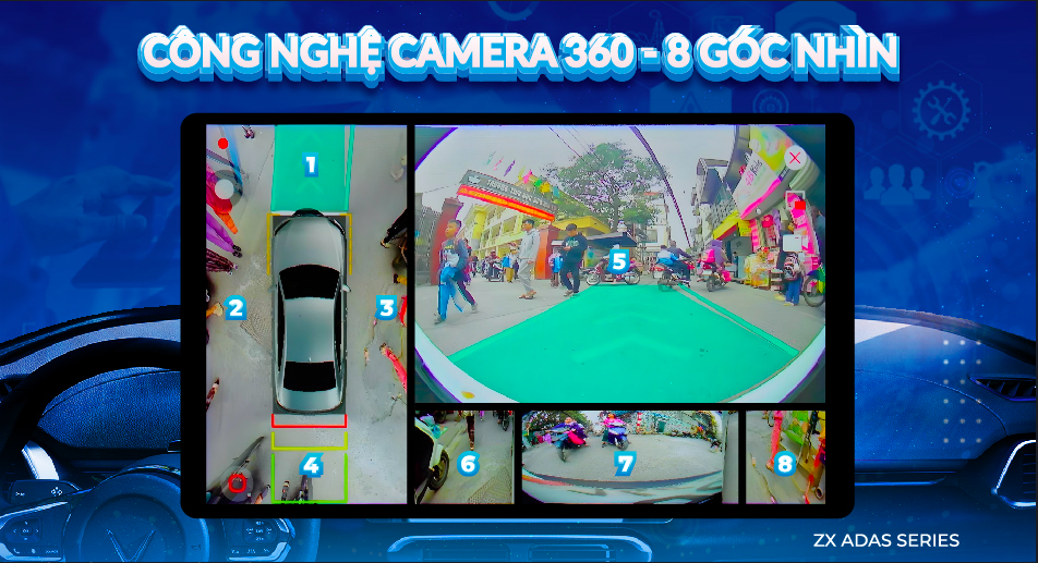 Công nghệ Camera 360 trên màn hình ZX ADAS tích hợp 8 góc nhìn thông minh, hiển thị đồng thời hình ảnh toàn cảnh quanh xe theo thời gian thực. Ứng dụng AI xử lý hình ảnh tiên tiến, giúp ghép nối khung hình mượt mà, giảm méo hình và tăng độ chính xác đến từng centimet.