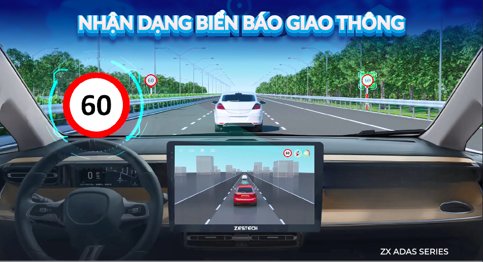 Tính năng Nhận Dạng Biển Báo Giao Thông (TSR) trên ZX ADAS ứng dụng trí tuệ nhân tạo AI kết hợp hệ thống camera ADAS đa góc nhìn, giúp nhận diện chính xác và nhanh chóng mọi loại biển báo giao thông như: biển giới hạn tốc độ, cấm vượt, dừng đỗ, biển chỉ hướng...