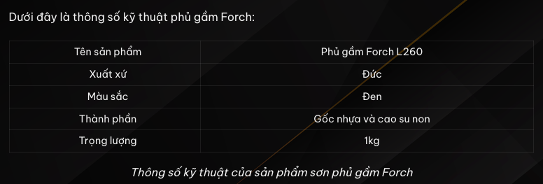 Sơn phủ gầm Forch là một loại sơn phủ gầm ô tô được sản xuất tại Đức có chức năng chuyên dụng bảo vệ dàn gầm và hốc bánh xe khỏi sự ăn mòn do nước mưa, sình lầy, axit, đồng thời ngăn chặn trầy xước do đá văng hay cạ gầm.. Sản phẩm này đã được nhiều trung tâm chăm sóc ô tô uy tín sử dụng và nhận được nhiều đánh giá tích cực từ phía chủ xe.