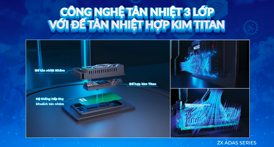 Công nghệ tản nhiệt 3 lớp thông minh của ZX ADAS, kết hợp đế hợp kim Titan cao cấp cùng quạt tản nhiệt, giúp thiết bị luôn vận hành ổn định, bền bỉ trong mọi điều kiện thời tiết khắc nghiệt.