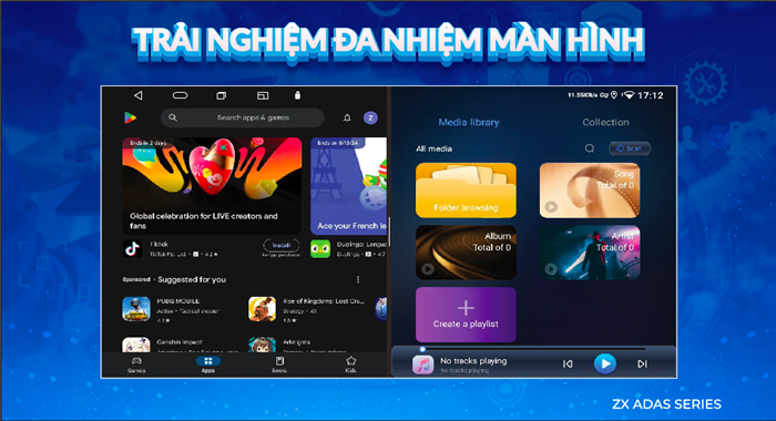 Tính năng Hiển thị đa nhiệm màn hình trên ZX ADAS cho phép mở đồng thời nhiều ứng dụng trong cùng một giao diện, giúp người lái xe vừa giải trí, theo dõi thông tin, vừa dẫn đường an toàn mà không cần chuyển đổi giữa các tab hay ứng dụng riêng biệt.