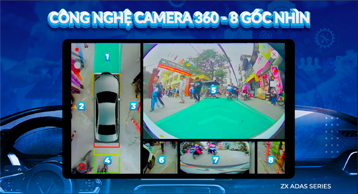 Công nghệ Camera 360 trên màn hình ZX ADAS tích hợp 8 góc nhìn thông minh, hiển thị đồng thời hình ảnh toàn cảnh quanh xe theo thời gian thực. Ứng dụng AI xử lý hình ảnh tiên tiến, giúp ghép nối khung hình mượt mà, giảm méo hình và tăng độ chính xác đến từng centimet.