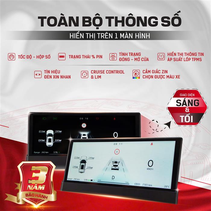 Tốc độ, hộp số, trạng thái % pin, ODO, trạng thái đèn và cửa, nhớ điều hoà...